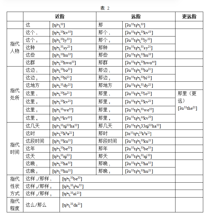 丽江市地形复杂,交通不便,即使是丽江坝土语内部也存在少量差异。对于指示词,差异多体现在调值上。但从总体上看,基本指示词[tşʰʅ33]和[ʔɑ55tşʰʅ33]是通用的发音,与其他语素组合构成纳西语的指示词系统。表2根据本体意义分类,分别列举了一些常用指示词。