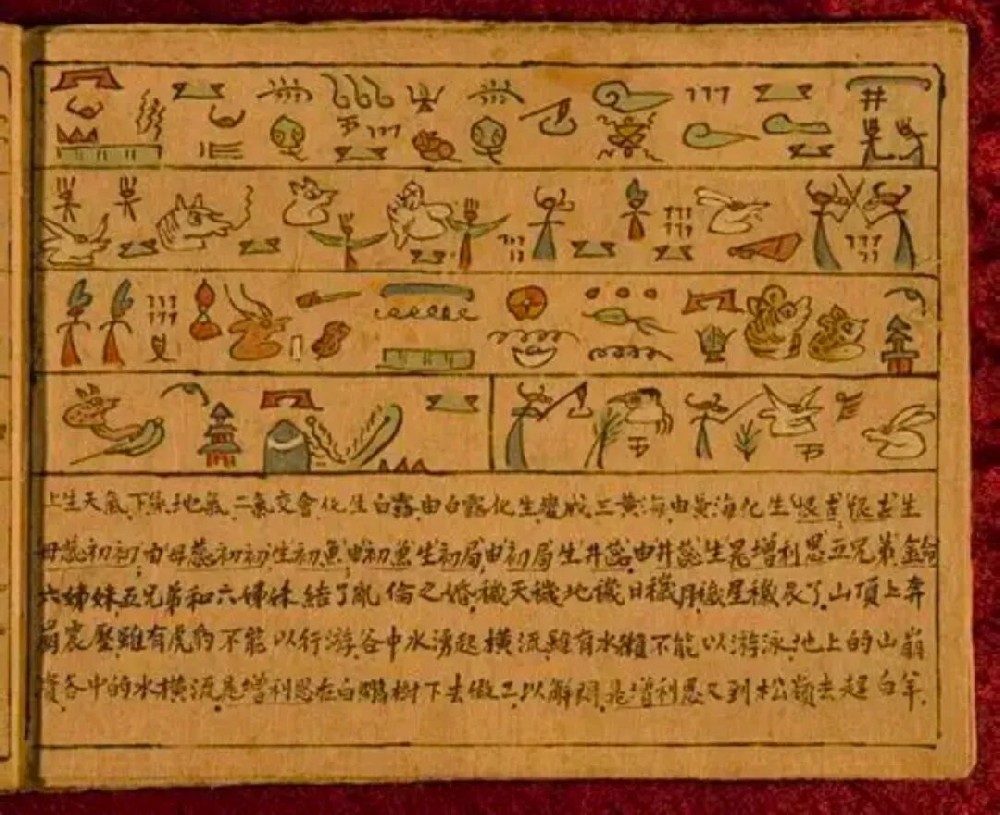 值得注意的是在《索索科》《子土从土》中出现了 “天上出现九个太阳、七个月亮” 的情节,而《崇般图》中却无此情节,但在《祭署・求雨》《延寿仪式・居那若罗神山与含依巴达神 树的出处来历》等经书中却有类似情节,这说明东巴在书写经书时作了处理。另一本东巴经《日仲格孟土迪空》也有射杀日月神话,此经书名可译为 “阮可人的开天辟地”,系阮可人的创世纪。此经书在玉龙县宝山乡一带流传,明显融合了纳西族东、西部方言区的创世史诗特点。