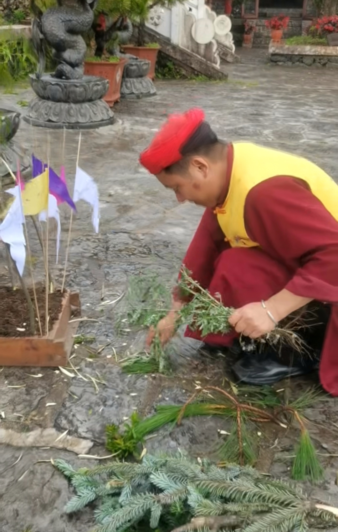 在以前,顶灾仪式以家庭或村寨为单位举行,一般是东巴占卜确定或灾害不断的时候举行。仪式分为生祭和熟祭两个部分,需要持续一整