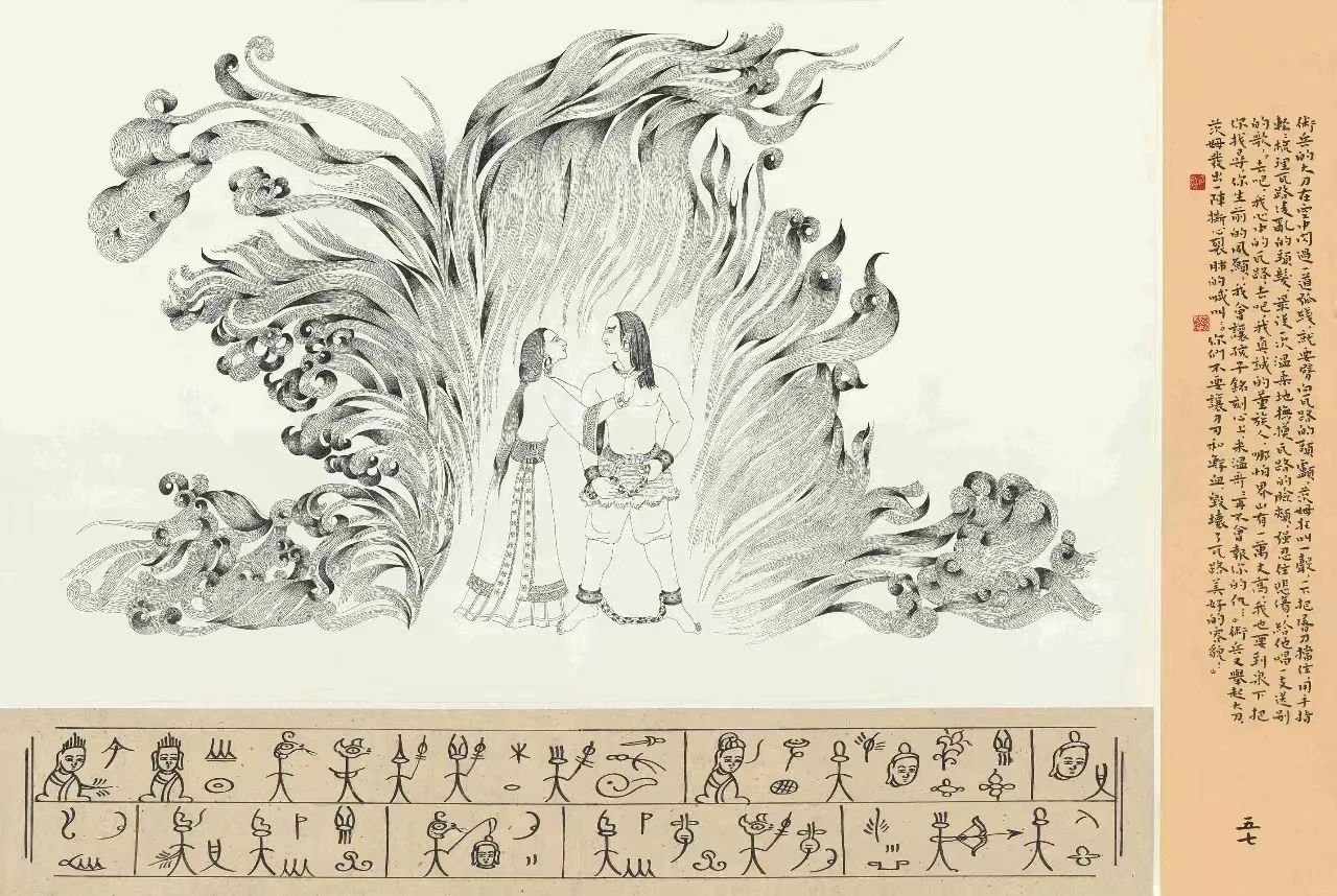 第二,描绘了纳西先民充满奇幻色彩的古代生活画面。英雄时代人们的社会活动比我们想象的复杂得多,即有相当的文明程度。除了打仗以外,人们赖以生存的牧猎、农耕、纺织、建造等生产实践和劳动实践也是构成社会现实生活的重要内容。英雄时代是一个力崇拜的时代,人力、物力、财力、自然力(或神力)统统是人们崇拜的对象,也是人们审美的感知对象。在一切物质活动中力显得意义重大,人们靠一切力量,即自身的或外界的力量向自然界和社会索取更多的利益,所以无论物质活动也好,精神活动也好,都呈现出一派蓬勃的生机,努力创造着人类文明,作品所描绘和歌颂的正是这种创造力。因人类自身的伟力和智慧,大自然变得更加美好,生活幸福美满。东部落一片光明,人们辛勤劳作,安居乐业,生息繁衍,部落祥和、民族兴旺,还有神赐的含英巴达神树、居那若罗神山、米利达吉神海,高山、牧场、草原,绿水幽幽、青山绵绵,牛羊遍地,一派和平、宁静、美好的生活景象。在这光明幸福的人间天堂,人们感恩于米利东主,也感恩于神灵的赐予。米利术主的女儿给饶茨姆也被东部落的美好景象所迷醉,流连忘返,憧憬着未来。她与米利东主的儿子阿路正畅饮着爱情的甘露,他们在海子边、树林里、草滩上谈情说爱,互相变幻成各种动物嬉戏、追逐,试探情感,“东若阿路灵魂作变化,变成一只白鹰,给饶茨姆灵魂作变化,变成一只黑鹰,白鹰和黑鹰在天空中游玩”。他们还变成黑白两只老虎“在高山上游玩”;变成黑白两只牦牛“在高山草原游玩”,美好的爱情洋溢在大自然中,空中的彩云、水中的彩色鱼儿在畅游,树林百鸟鸣唱,神树开着金花银花,金色的小狗在欢叫。这一切自然景物都因了美好的爱情而蒙上了一层神奇瑰丽的色彩,气象万千的大自然在人们富于创造性的精神世界里似乎也富于生命而“活”了起来,人的生命与自然的“生命”、人的“情”与自然的“景”、社会现实生活与人的精神世界融为一体,才构成了如此奇幻的生活景象。作品通过古代纳西先民主观与客观的审美感知歌颂人类自身创造力的美和自然力的美,“人们在精神上、感情上和智力上越是发达,审美经验越丰富,他们所感知的自然现象的美越是能够在他们意识中唤起各种联想,从而他们的审美认识就会更丰富和更深刻,而他们的审美感也会更精细”,甚至人们赖以生存、牧猎、农耕的高山、草场、流水、动植物、空气、流云、阳光、星月等,都成为精神创造、审美意识的“原料”,甚至成为培育民族性格、民族文化心态,熏陶人们美好情怀的重要因素。因这些和天空、泥土,高山、河流、云彩、飞禽走兽结合在一起的审美意识,才使作品散发着浓郁古朴的原始时代的生活气息,构成了令人神往的、返璞归真的原始自然境界和艺术境界。