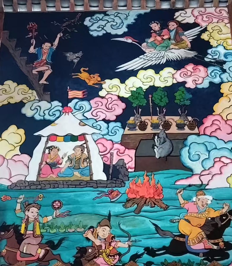 过了三天后,美令东主呀,不看不甘心,回到东海边,来观看动静;茫茫碧海中,走出一个漂亮的姑娘;她的身体呀,犹如宝石闪绿光。无人知晓她名字,自我介绍称次早金母;美令东主呀,从此有了白天同劳作伴侣,晚上互谈心配偶。美令东主、次早金母两人呀,开了白的天,辟了白的地;修下白房屋,建下白村庄;高山牧场里,养九种牲畜;肥沃土地上,播百样粮种;养下九个儿子建九寨,养下九个女儿辟九庄;自己做活自己来收获,自己放牧自己来挤奶;心头想的是好事,生活过得很美满。